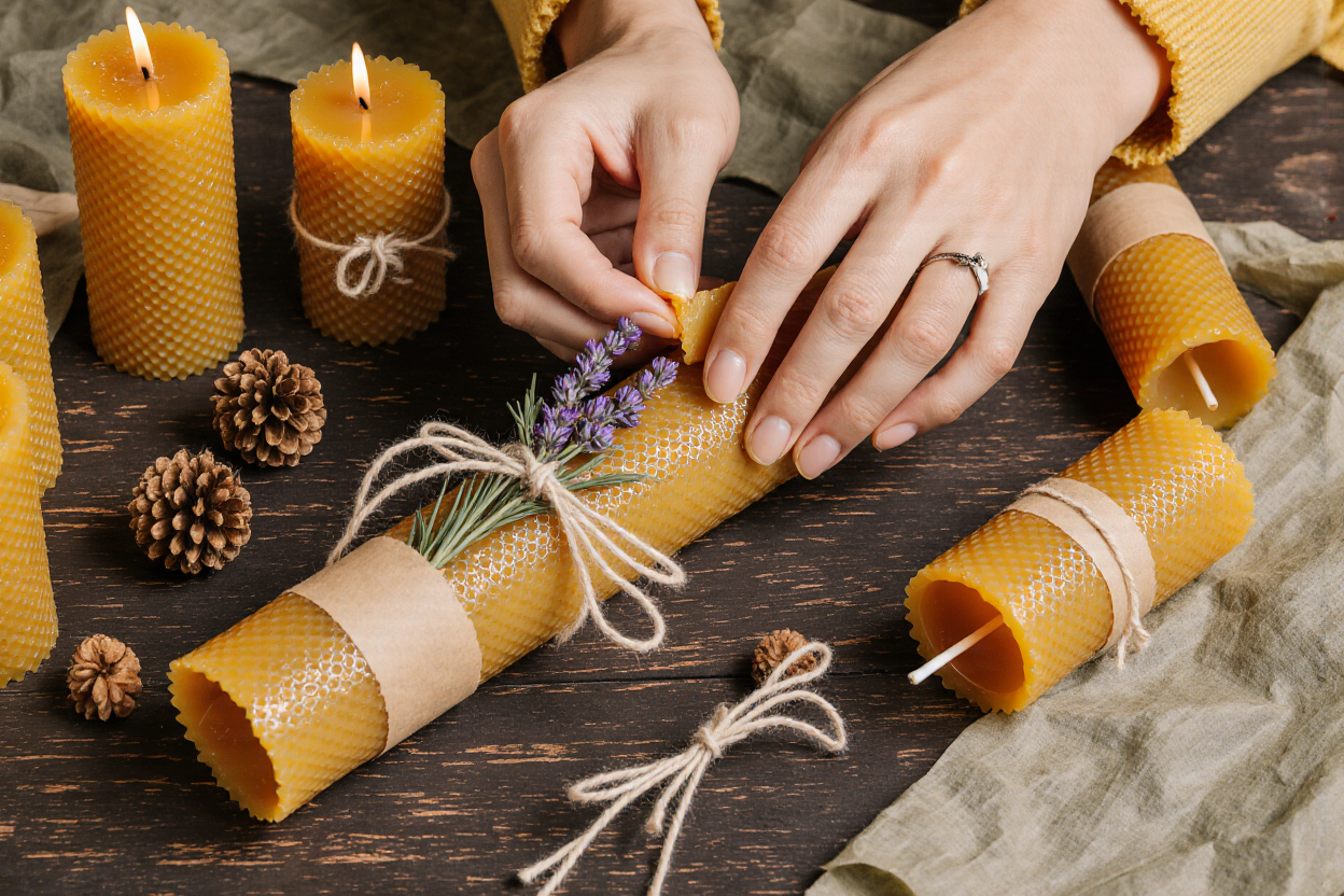 Гости своими руками создадут свечу из натуральной вощины, добавив в неё праздничный аромат — хвойные веточки и каплю эфирного масла.